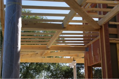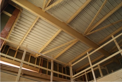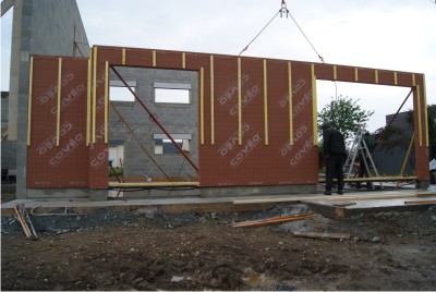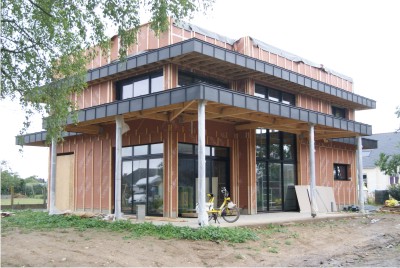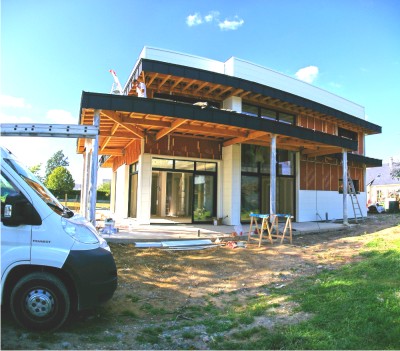 Ci-dessus : Pose du bardage, à droite : la dalle chauffage est coulée, fin du placo 14-09-2011.