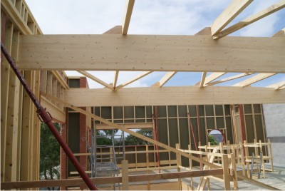 Ci-dessus, à gauche : Les panneaux de bois s'empilent 15-05-2011, à droite: l'ossature de la charpente 19-05-2011.