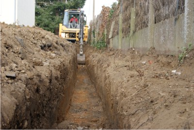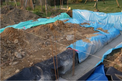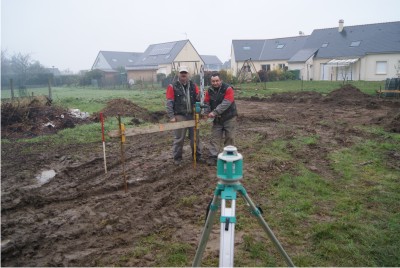 Ci-dessus, à gauche : Tranchée de viabilisation 17-02-2011, à droite: Implentation de la maison 23-02-2011 (Ets Robineau).