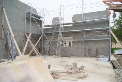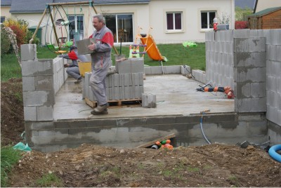 Ci-dessus, à gauche : Les premiers parpaings 29-03-2011, à droite: 7 mètres de haut de parpaings 13-04-2011.